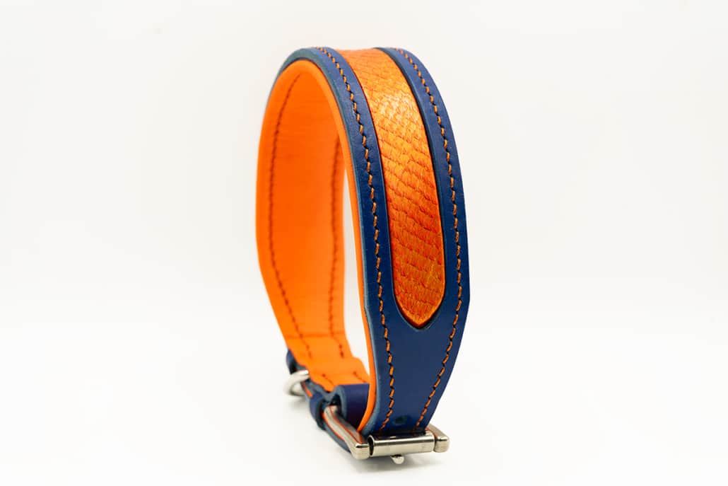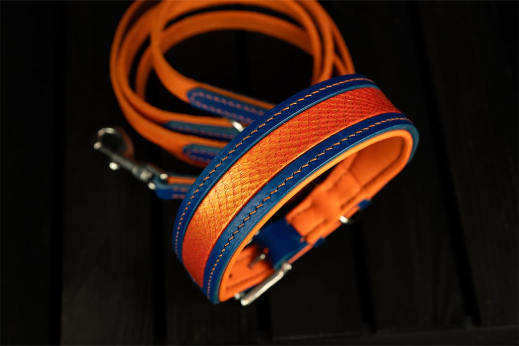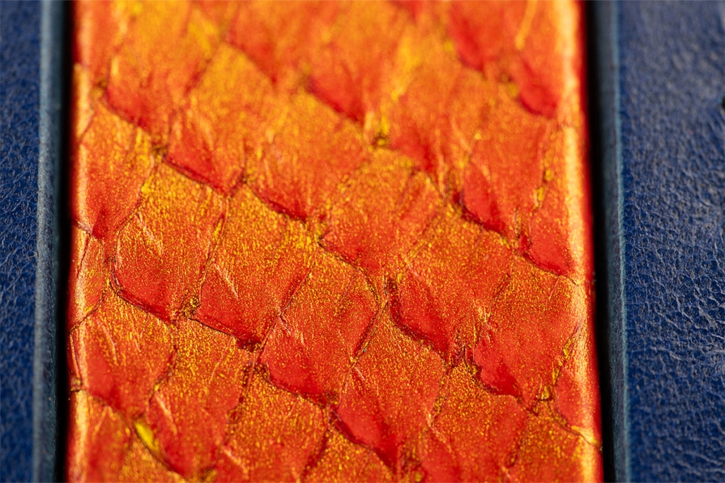 - Signature-Look: Blau/Orange mit Fischleder-Inlay in Glut-Optik – auffällig, aber edel