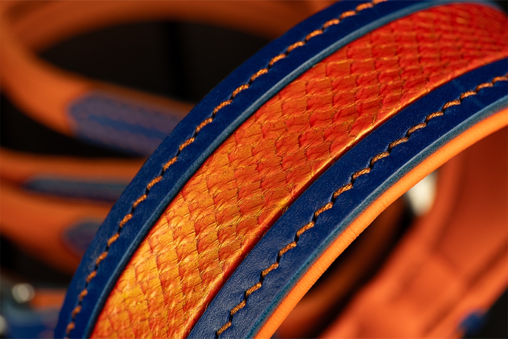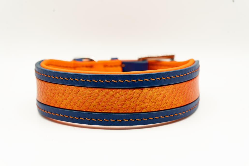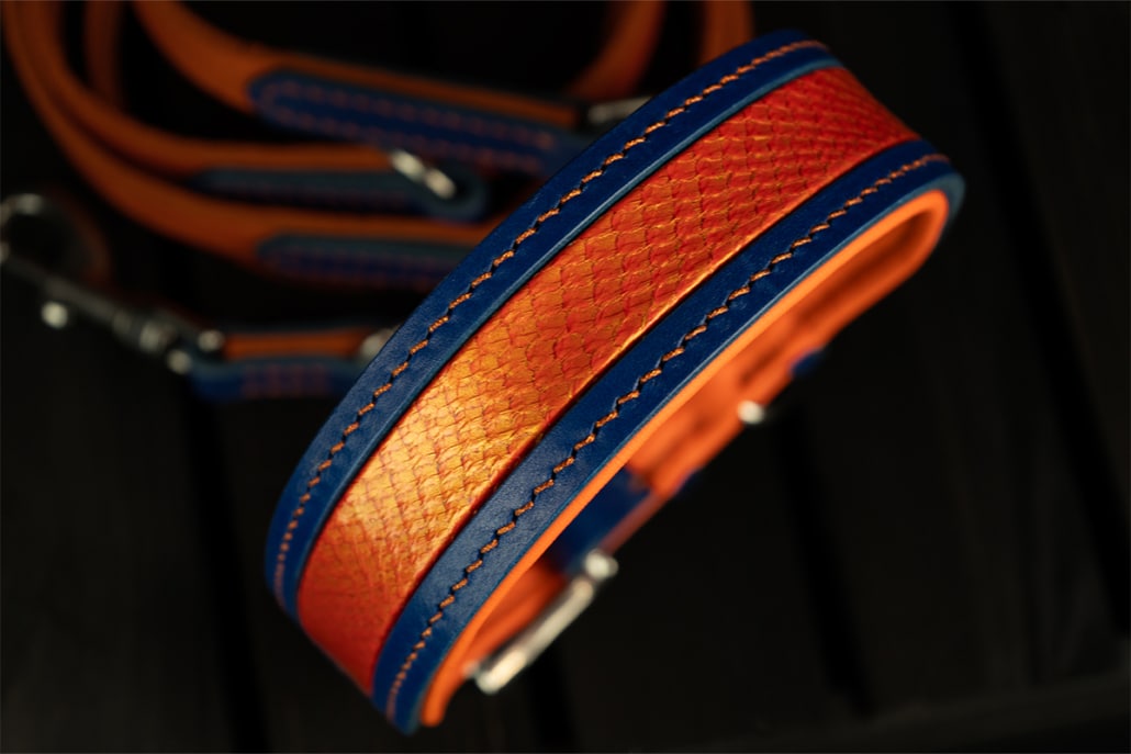 Edles Hundehalsband in Blau & Orange mit Fischleder-Inlay in Lagerfeuer-Tönen