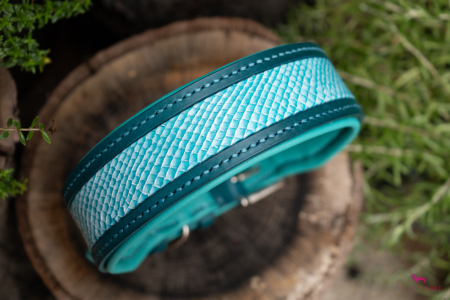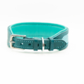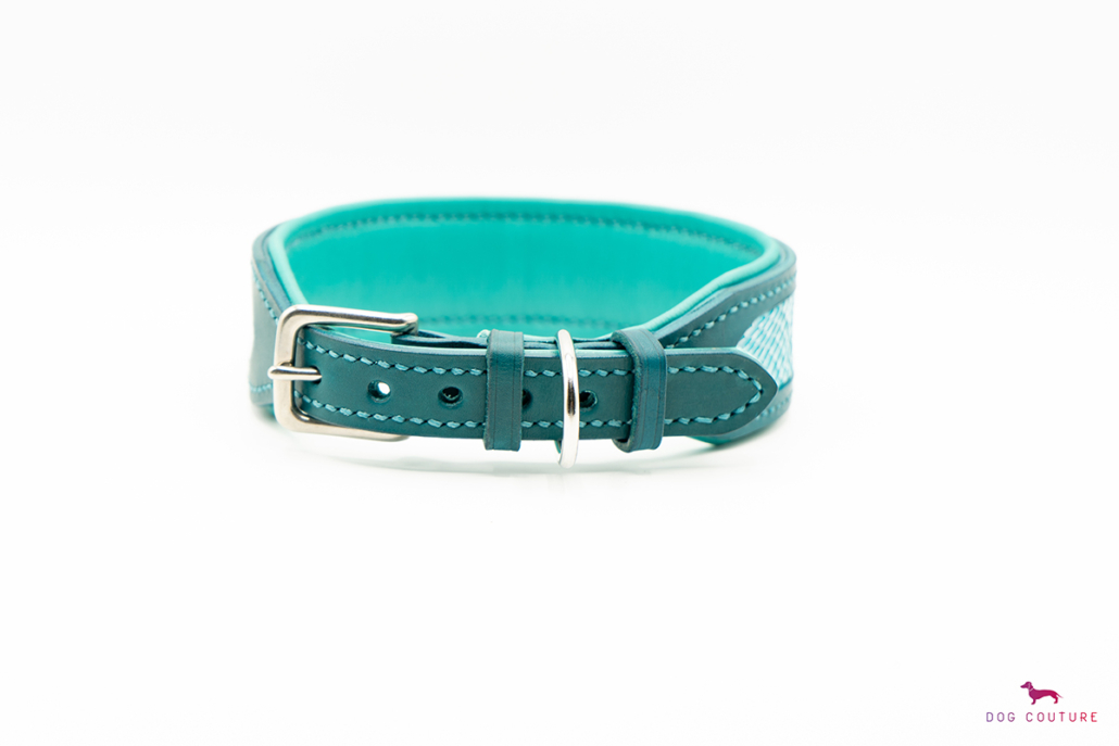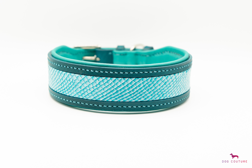 Stell dir vor, dein Hund bringt die Farben des Ozeans direkt in den Park! Unser CaribbeanOcean Halsband kombiniert türkisfarbenes Vollleder mit einem schimmernden Fischleder-Inlay, das an die Meeresbrandung erinnert. Unterlegt mit butterweichem Nappaleder, sorgt es für Stil und Komfort – weil dein Hund nur das Beste verdient.