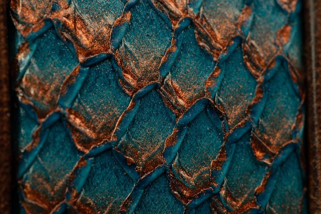 • Korallenriff-Effekt: Fischleder-Inlay mit schimmernder, lebendiger Struktur