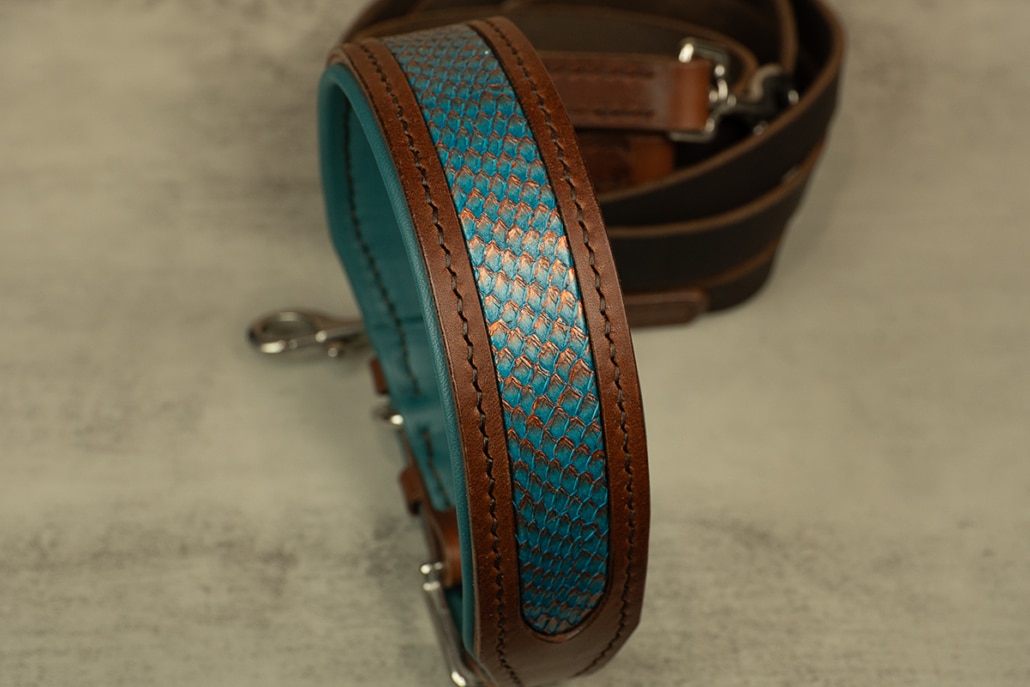 Lederhalsband mit schimmerndem Fischleder wie ein Korallenriff & Hundeleine im Set