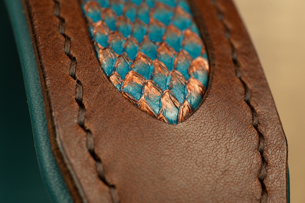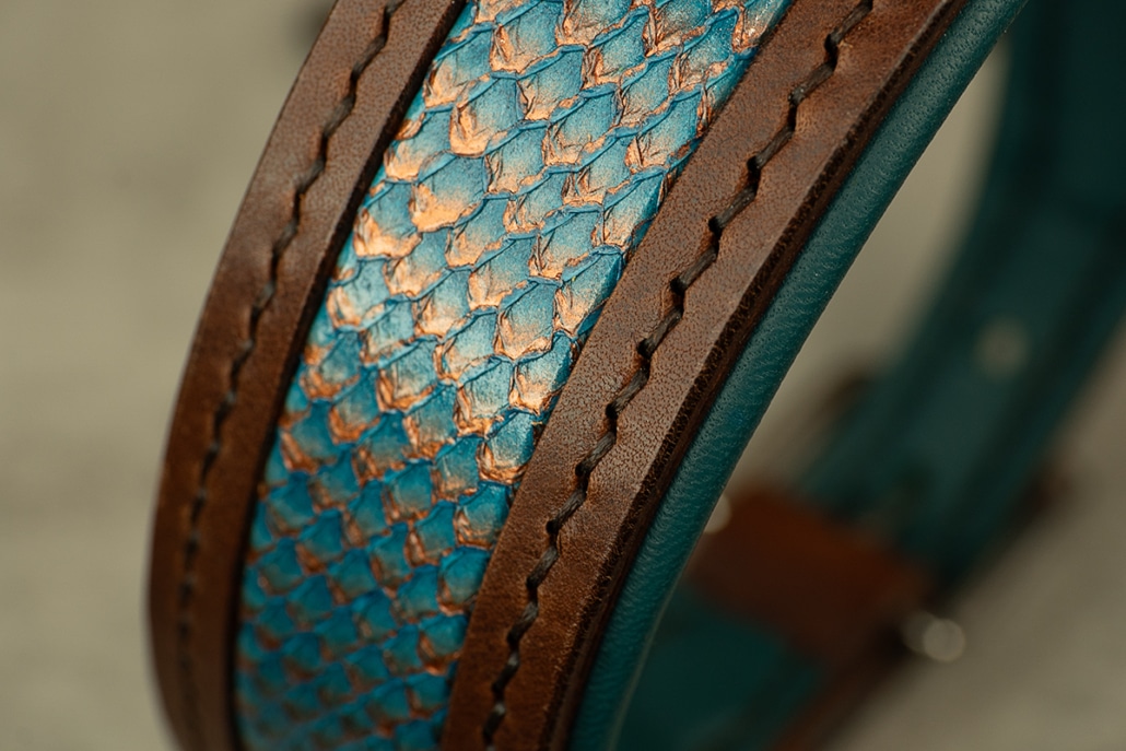 Das DeepSea Set lebt vom Detail – und dieses Detail ist das Fischleder-Inlay im Halsband, das wie ein Korallenriff unter Wasser schimmert. Je nach Lichteinfall wirkt es mal tiefer, mal lebendiger, mit dieser besonderen Struktur, die man nicht drucken oder imitieren kann. Es hat Tiefe, Bewegung, Charakter – genau wie das Meer selbst.