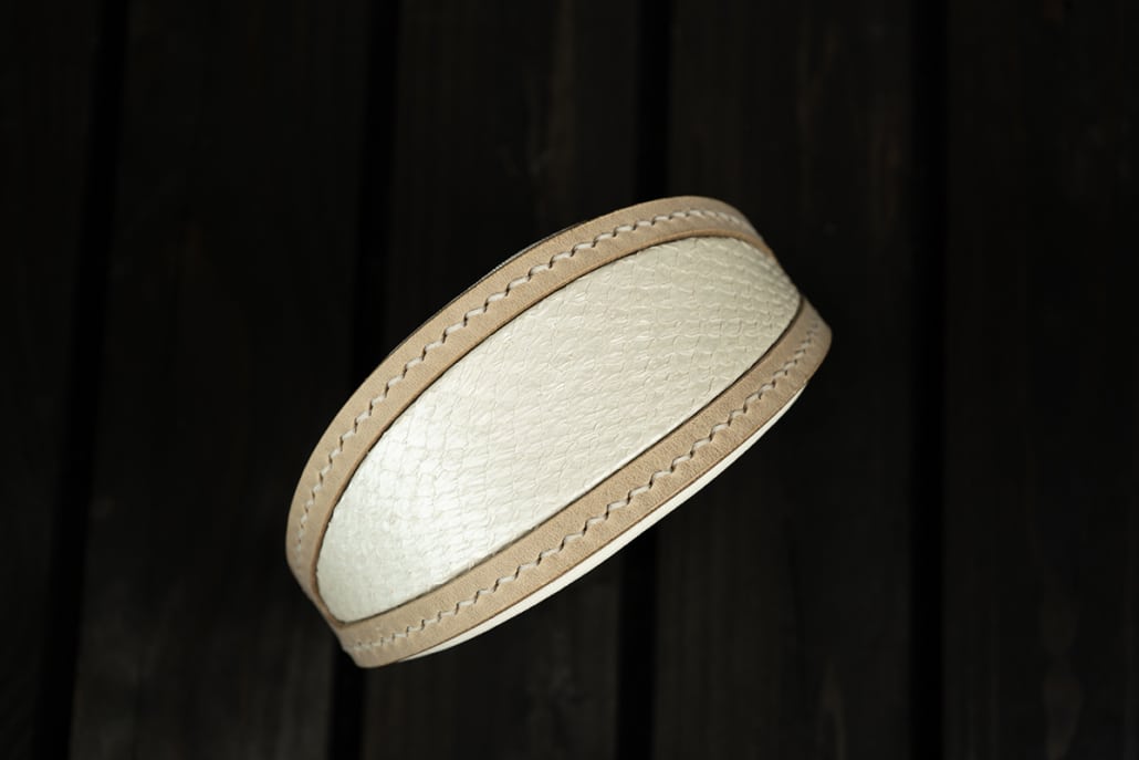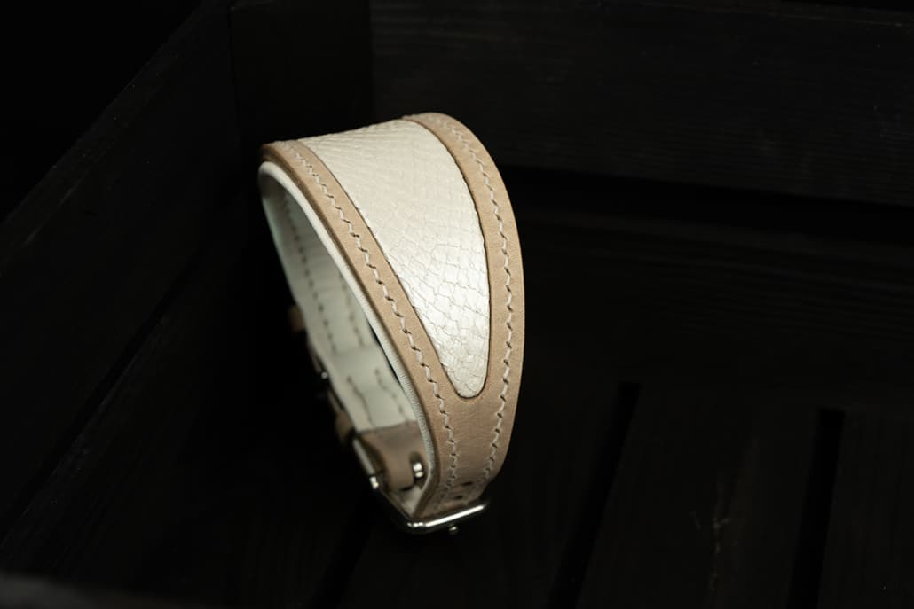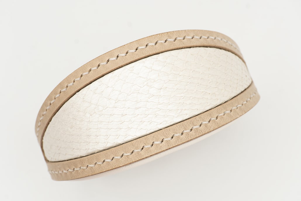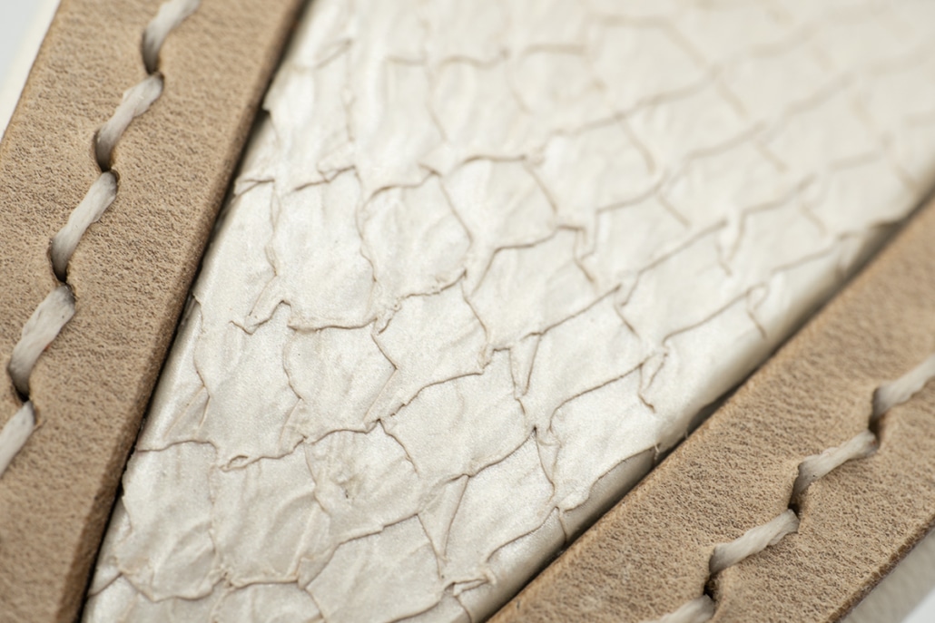 - Cremeweißes Fischleder-Inlay: wenn die Sonne draufkommt, macht’s dieses feine Schneeflocken-Glitzern
