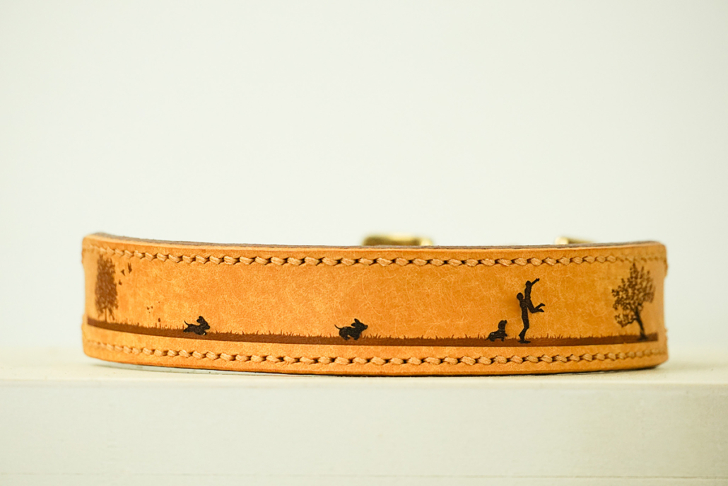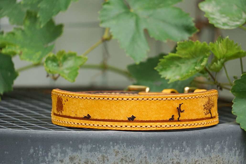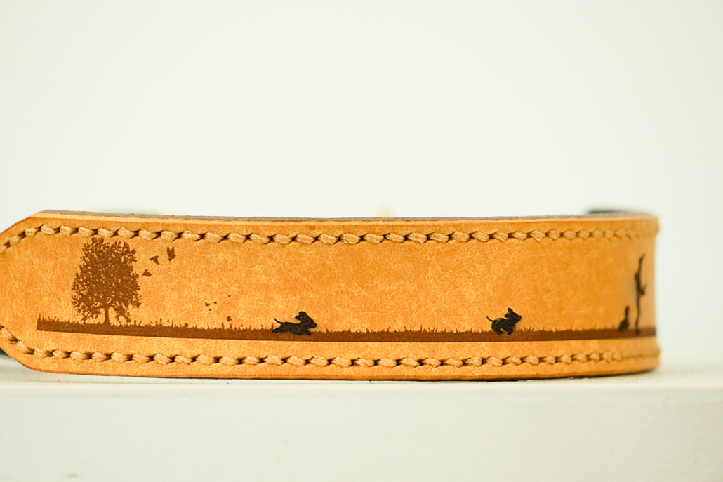 Klein, mutig und voller Lebensfreude – genau wie der Dackel selbst! Unser „DachshundLove“ ist eine Hommage an die treuesten aller Jagdnasen. Das warm-gelbe Leder ziert eine liebevoll gelaserte Szene: tobende Dackel, ein Mensch im Spiel, Bäume, Natur – ein echtes Mini-Panoramawerk zum Umhalsen.