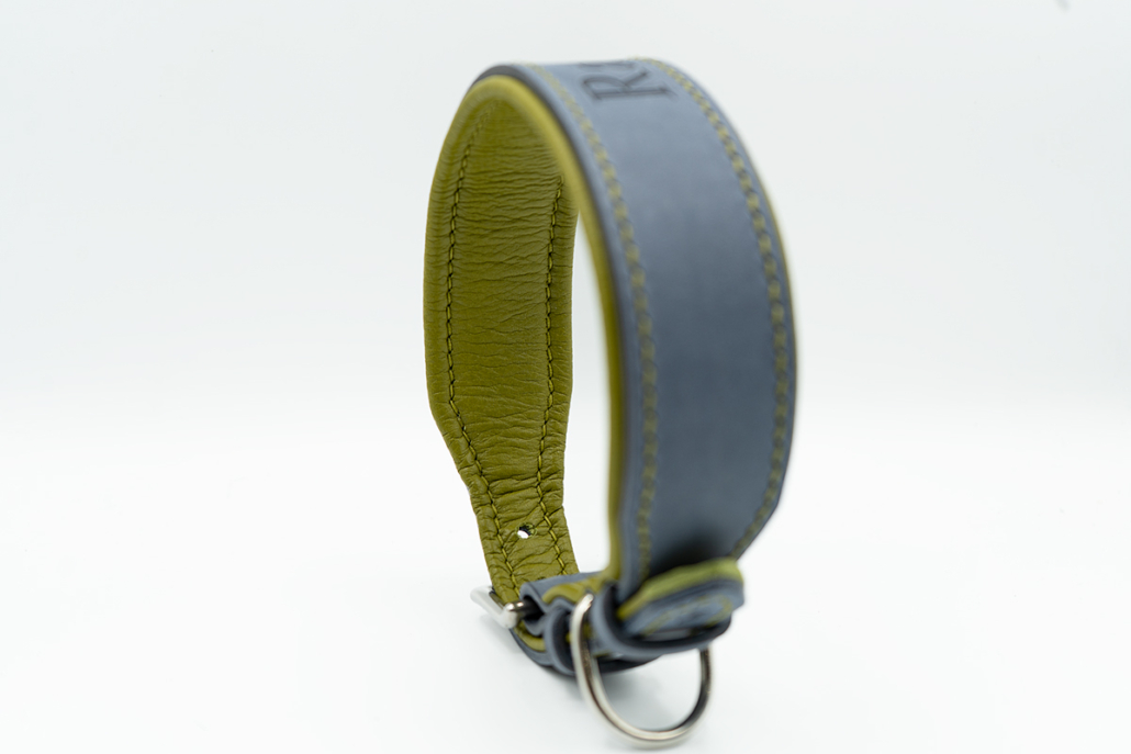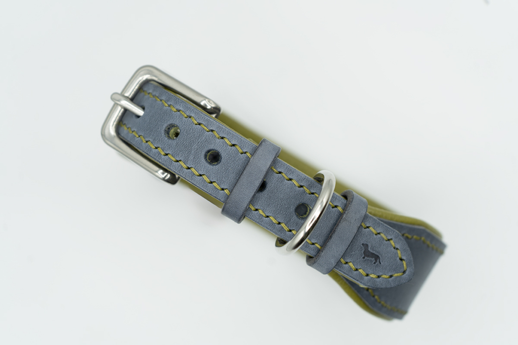 Das matte Schiefergrau des Leders verleiht diesem Halsband eine ruhige, elegante Note, während das limettengrüne Innenleder einen frischen, natürlichen Akzent setzt. Die feinen Kontrastnähte verbinden beide Farben harmonisch und sorgen für einen rundum hochwertigen Look. Dank der weichen Polsterung bietet das Halsband „Vintage Slate“ nicht nur Stil, sondern auch höchsten Tragekomfort – perfekt für den täglichen Einsatz.