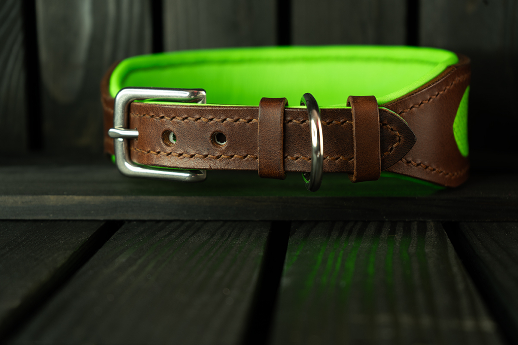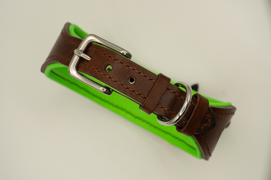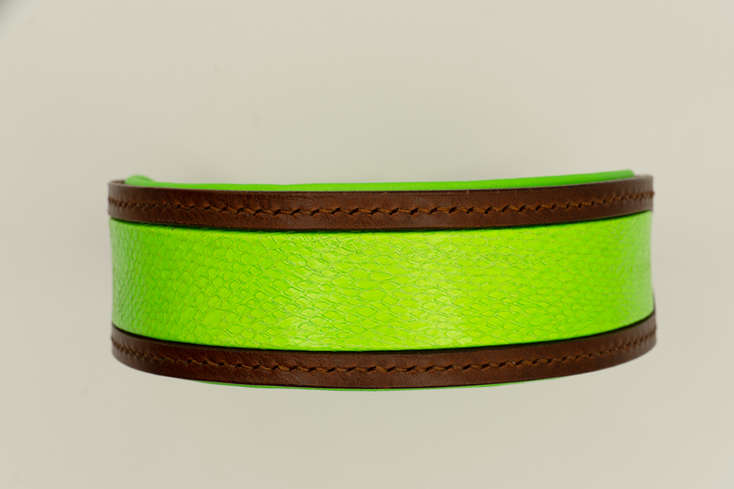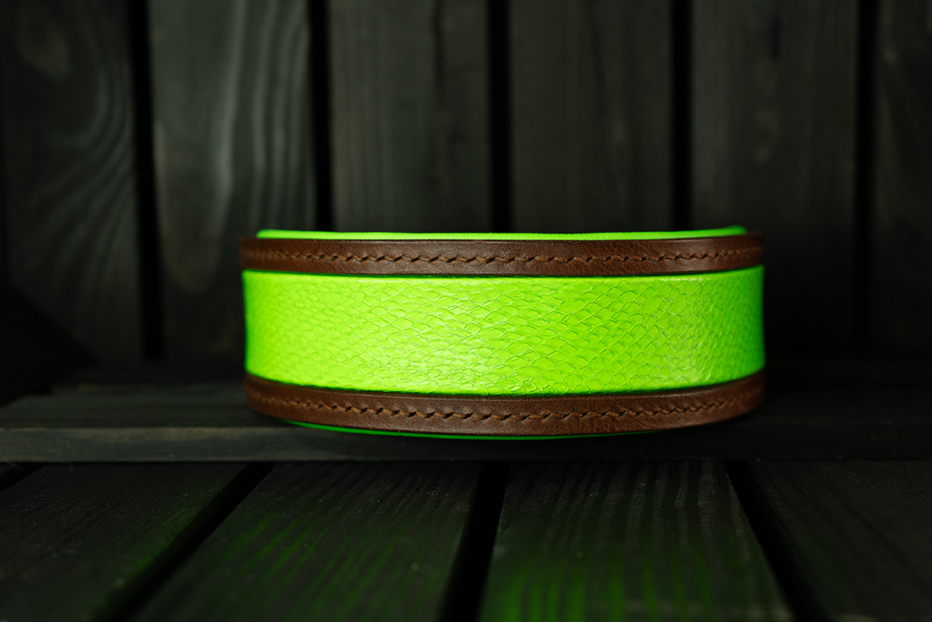 - Exklusives Hundehalsband aus Leder mit neongrünem Fischleder-Inlay
