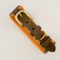 Dieses exklusive Halsband vereint urzeitliche Anmutung mit moderner Handwerkskunst. Der olivgrüne Lederriemen bildet die erdige Basis – robust, weich und zeitlos. Das Highlight: eine edle Applikation aus orange-gold schimmerndem Fischleder, das in Struktur und Glanz an das legendäre Metall Orichalcum erinnert – einst das Zeichen von Reichtum und Macht in der untergegangenen Stadt Atlantis.