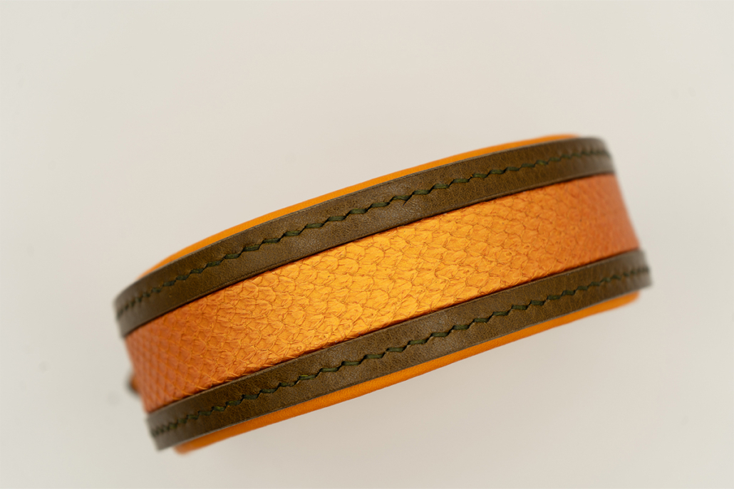 Jedes Stück ist ein Unikat: nachhaltig gefertigt, mit natürlichen Materialien und feinem Auge für Details. Das schuppenartige Muster des Fischleders bringt Lichtspiele ins Spiel – warm wie ein Sonnenuntergang, stark wie ein Artefakt aus alter Zeit.