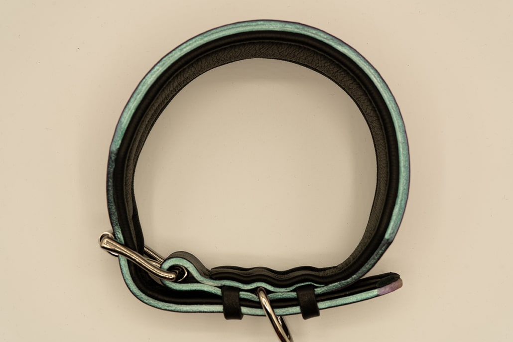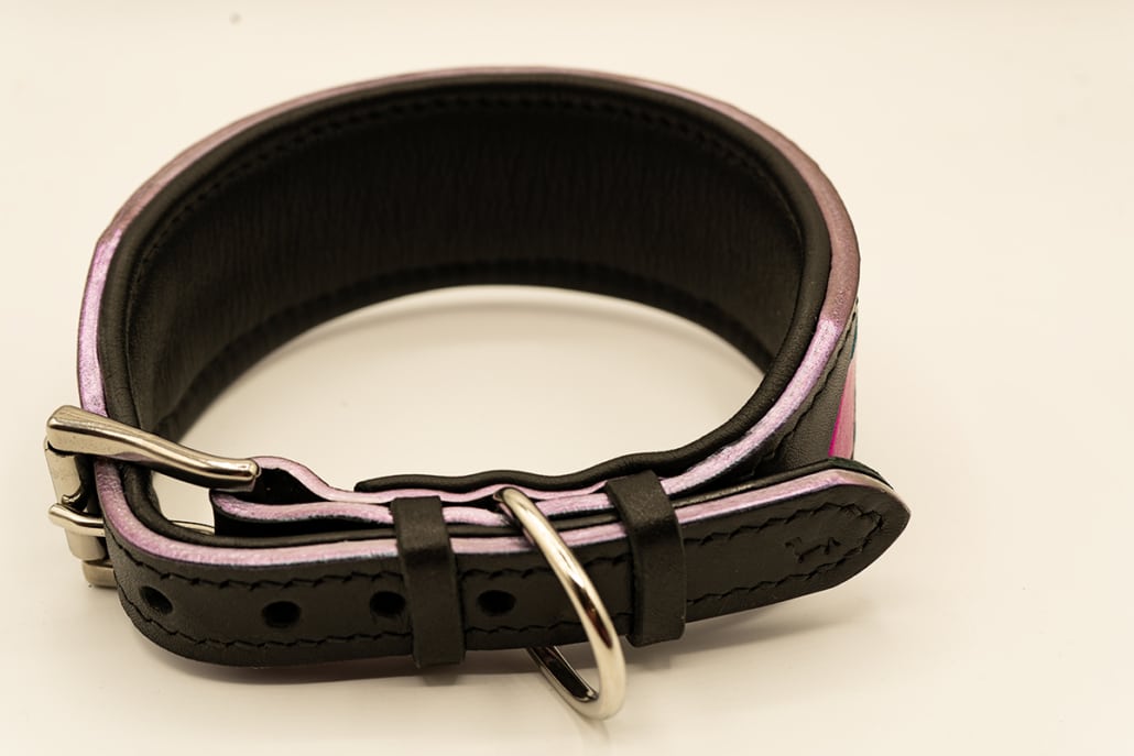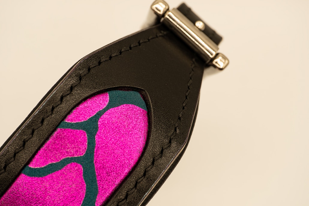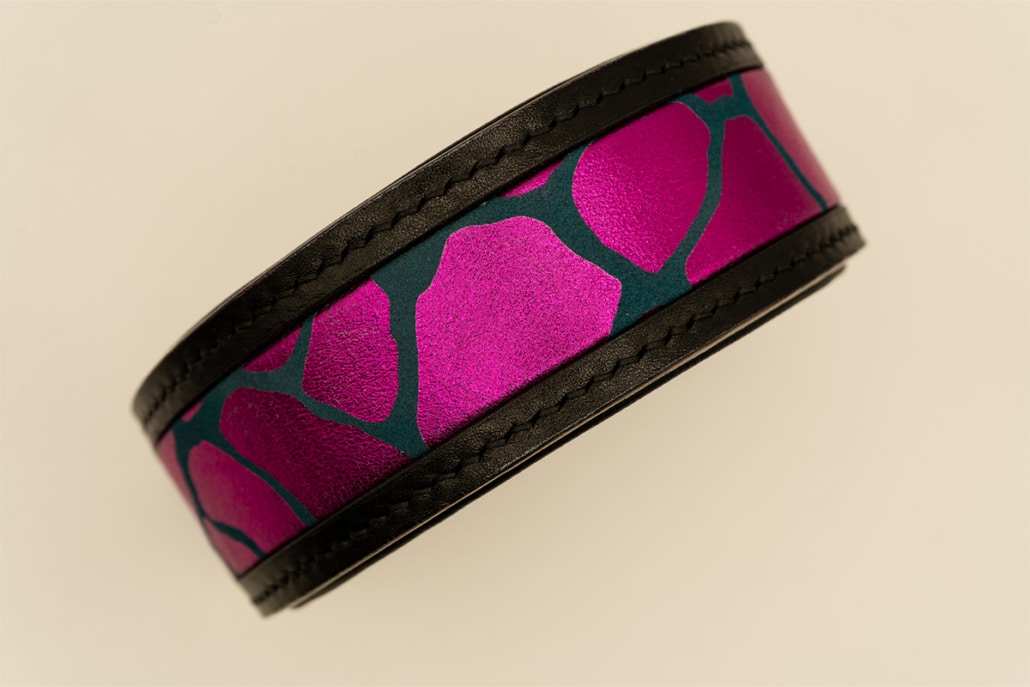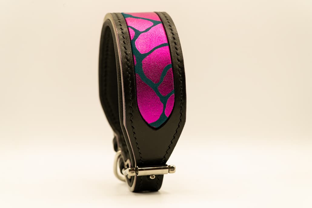 Das Herzstück bildet ein limitiertes Nappaleder-Inlay in metallic-pink Giraffenoptik. Auffällig, luxuriös und bewusst nicht reproduzierbar. Jedes Halsband ist Teil einer streng begrenzten Serie – kein Nachschub, kein „hab ich auch schon gesehen“.