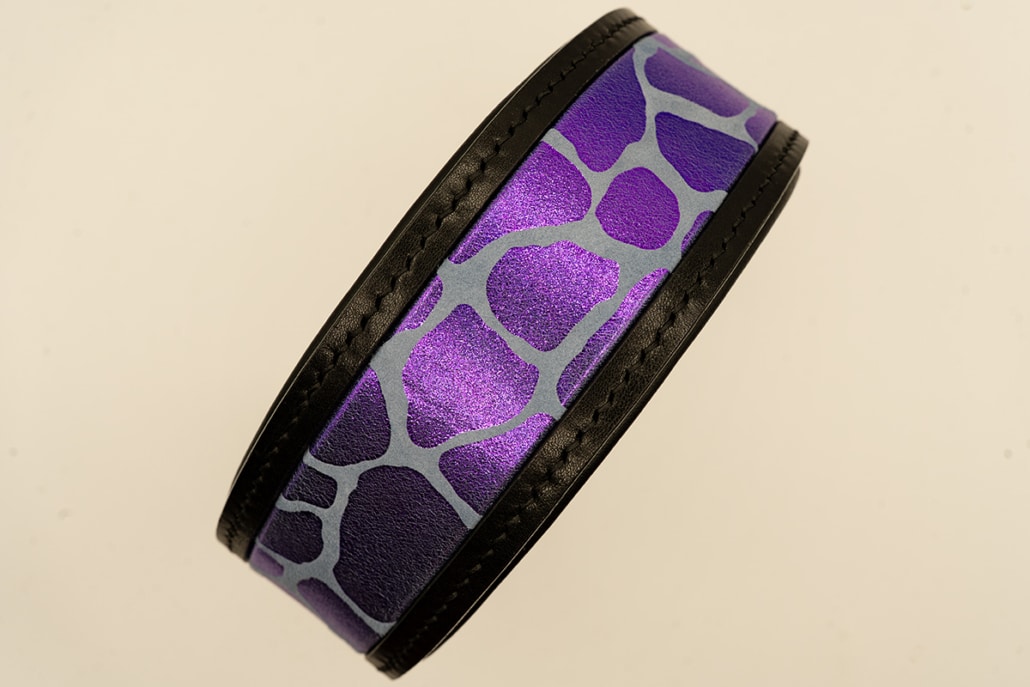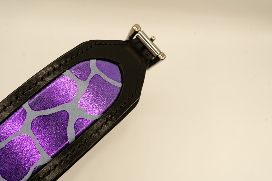 Das Herzstück bildet ein limitiertes Nappaleder-Inlay in metallic-lila Giraffenoptik. Auffällig, luxuriös und bewusst nicht reproduzierbar. Jedes Halsband ist Teil einer streng begrenzten Serie – kein Nachschub, kein „hab ich auch schon gesehen“.
