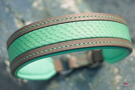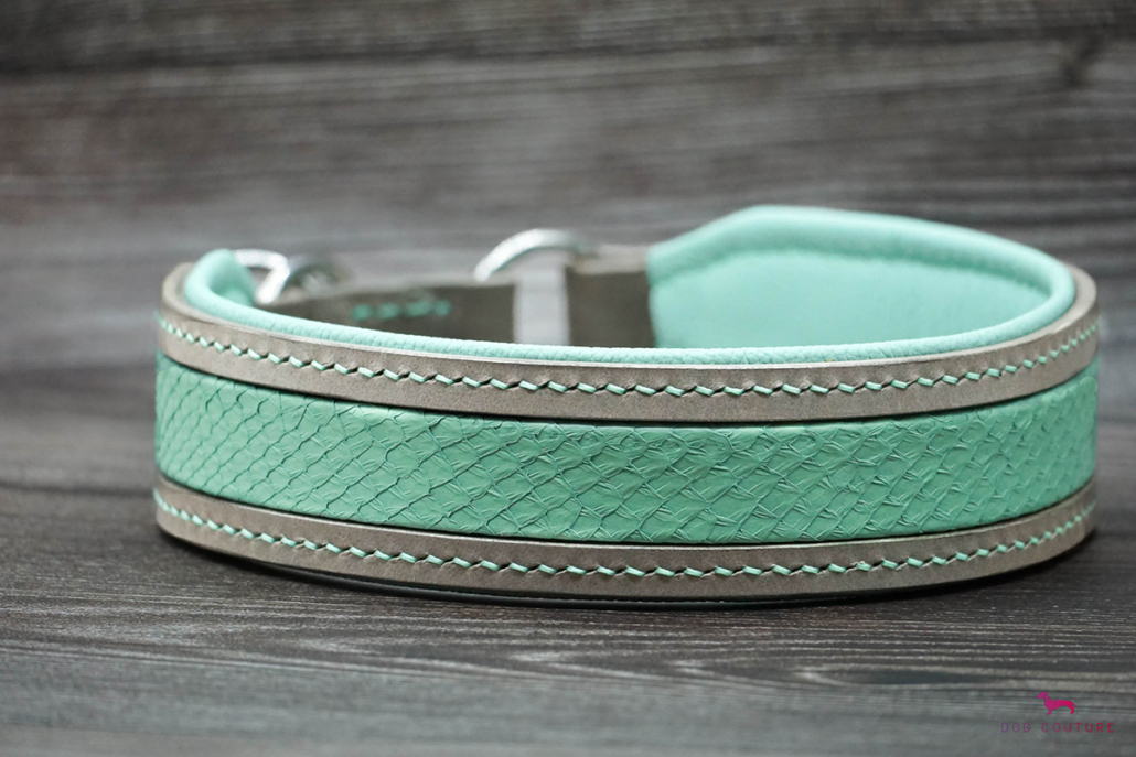 Hier trifft sanftes graues Leder auf einen Hauch von Jadegrün – und wenn das nicht schon edel genug klingt, gibt’s auch noch echtes Fischleder! Ja, genau: Fischleder. Und keine Sorge, es ist völlig geruchsfrei! Für all die Hunde, die mal so richtig mit ihrer Eleganz angeln wollen.