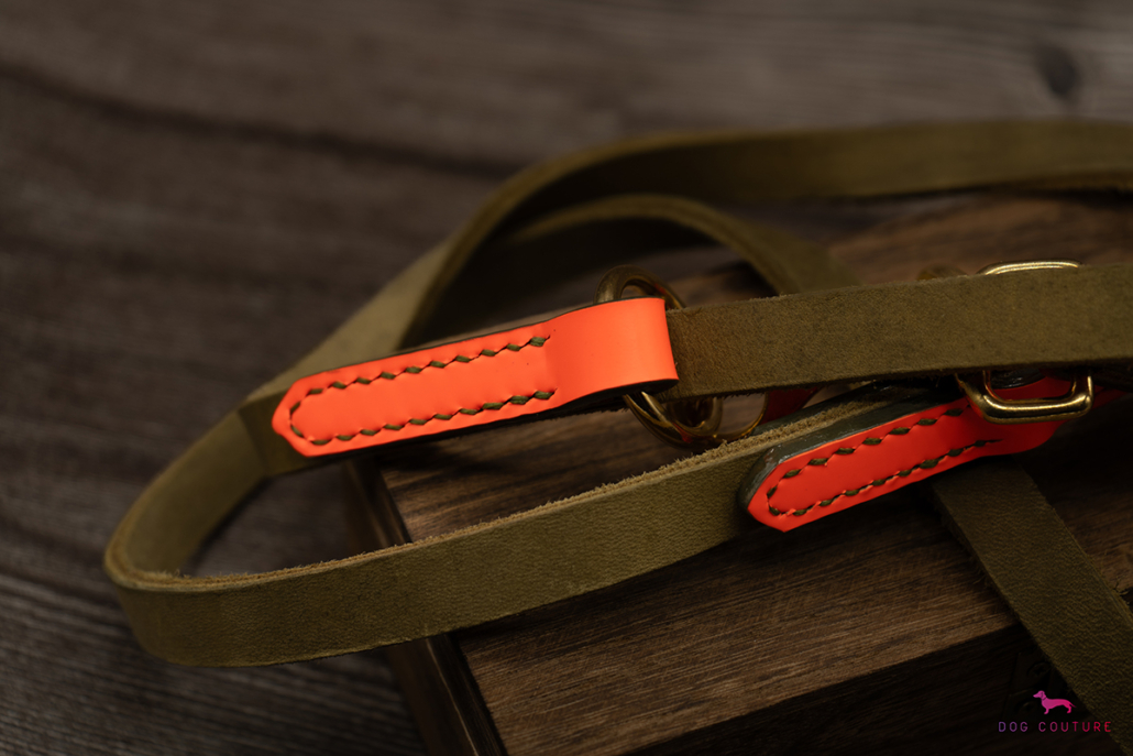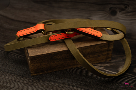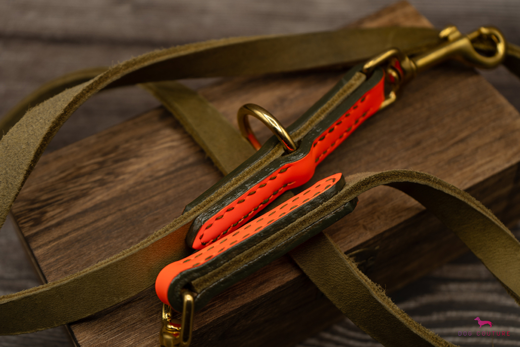 Das olivgrüne Leder bringt den Natur-Look, während die knalligen orangen Akzente für einen coolen Farbkick sorgen – perfekt für alle, die gerne auffallen (oder ihren Hund im Gebüsch wiederfinden wollen 😉). Robustes, butterweiches Leder liegt angenehm in der Hand und sorgt für einen sicheren Griff, egal ob auf dem Waldpfad oder der Großstadt-Safari.